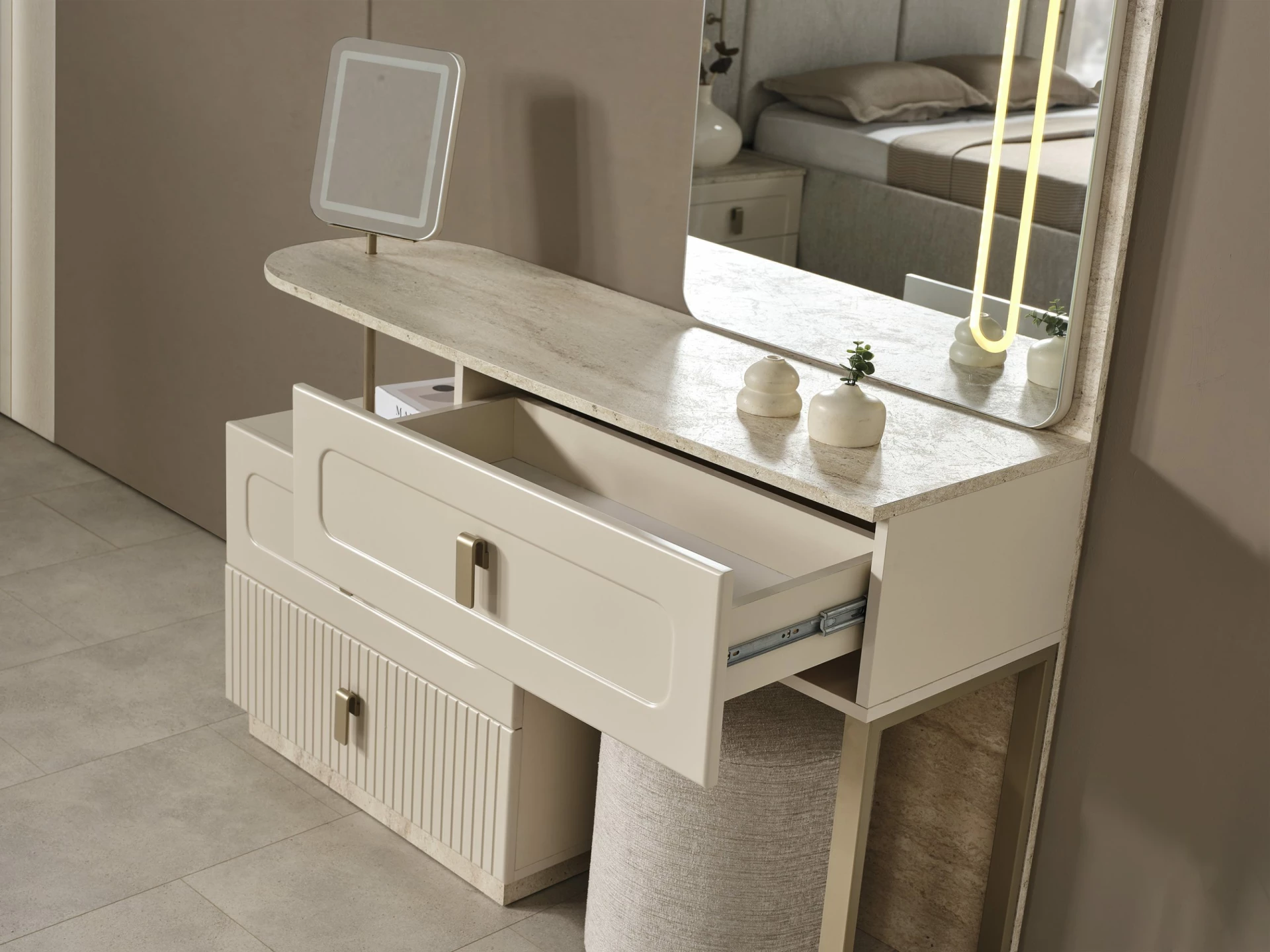 Geniş ve Fonksiyonel Tasarım: Lina, eşyalarınızı düzenli bir şekilde saklayabileceğiniz geniş çekmecelere ve dolaplara sahiptir. Bu sayede yatak odanız daima düzenli ve ferah kalır.
